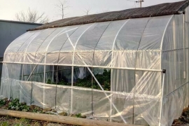 本大棚在薄膜的外面覆蓋了一層遮陰網(wǎng),遮陰網(wǎng)遮光率高,兩側(cè)可用卷膜桿卷起,使用非常方便