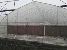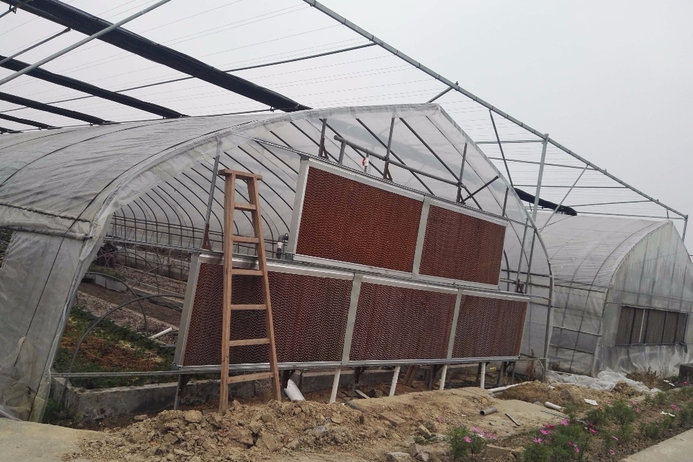本大棚配備了風機濕簾降溫系統(tǒng),在大棚的一端安裝風機,另一端安裝濕簾,在風機的作用下,大棚外部的空氣進入濕簾,穿過濕簾內部自上而下的水流時空氣的溫度降低,從而使大棚內部的溫度降低。