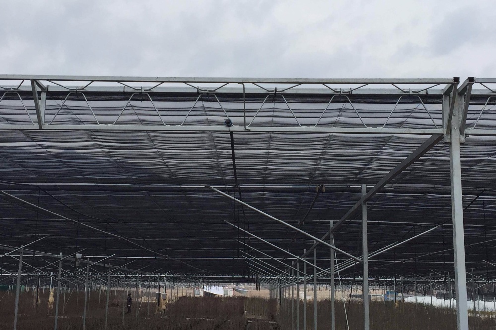 該系統(tǒng)實現(xiàn)夏季的遮陽降溫,使陽光漫射進出溫室,防止作物受強光灼傷,同時降低溫室4-6度??蛇x用不同遮陽率的幕布,或調節(jié)幕布的開合,以滿足不同作物的生長需求??棺贤饩€、防雹、遮陽降溫。作物對光照要求有所不同,用戶在選擇遮陽幕布時應根據種植作物的種類,所在地區(qū)和所建溫室類型來配置。