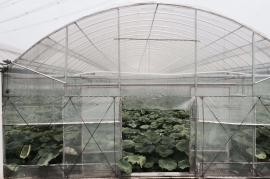 該產品由基礎、框架立柱,頂部拱管三大部分組成。點式獨立基礎,使大棚根基牢固;立柱采用熱鍍鋅方管,大大增強抗風抗雪強度;頂部由熱浸鍍鋅鋼管排列成平滑圓弧形,牢固兼美觀。同時天溝采用2mm厚熱鍍鋅板冷彎成型,容量大,排水及時;頂部天溝處和大棚四周均設置搖膜通風系統(tǒng),是大棚內部氣流通暢。此產品可根據需要實現相關配套設施,以便達到更理想的效果,如外遮陽系統(tǒng)、內遮陽保溫系統(tǒng)、降溫系統(tǒng)、加溫系統(tǒng)、噴滴灌系統(tǒng)等。